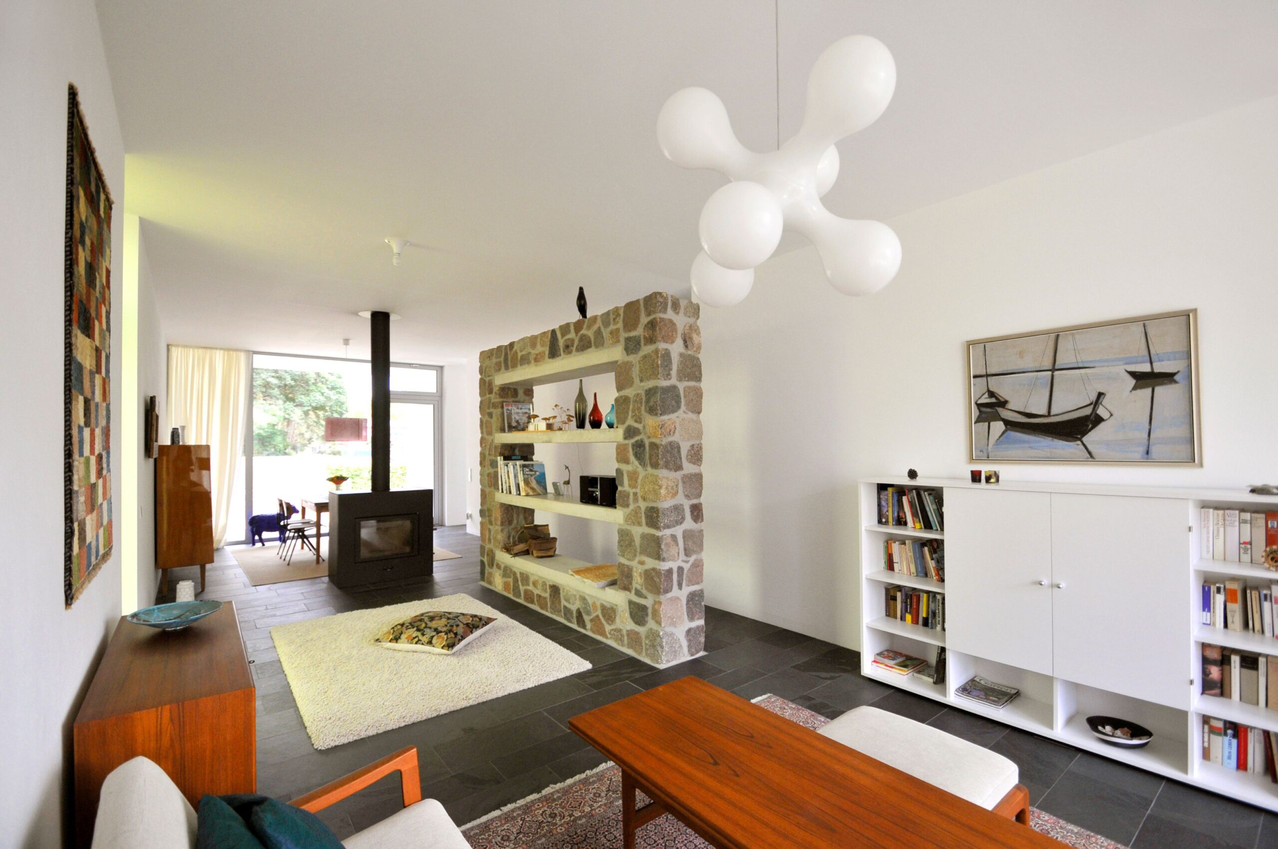 - Wohnzimmer mit Essplatz, Kaminofen, Stereoanlage, TV (Sat.-Empfang)