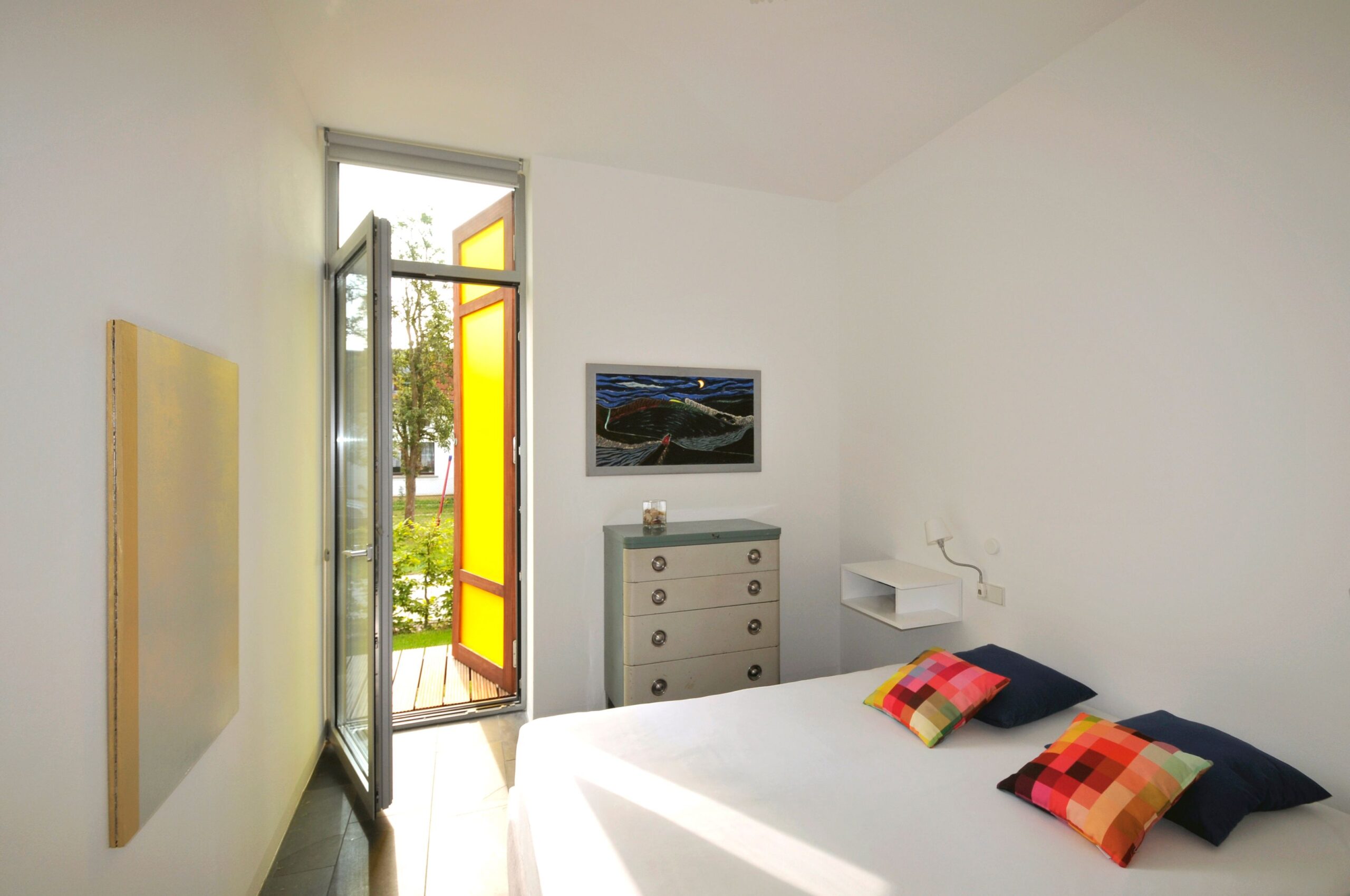 - Ein Schlafraum mit Doppelbett (160 x 200 cm), zweiter Schlafraum mit zwei Stapelbetten (90 x 200 cm) getrennt oder gestapelt aufstellbar, Kleiderschrank